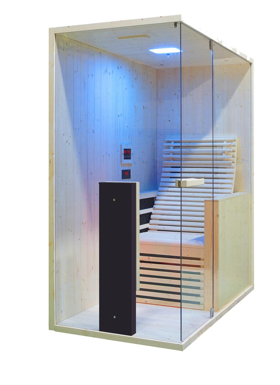 Sauna cu infraroșu Sole este fabricată din lemn de brad și dispune de un panou de control pentru o operare simplă și intuitivă. Ușa și ferestrele sunt fabricate din sticlă securizată transparentă, în timp ce mânerul este din lemn pentru un finisaj elegant. Iluminarea LED creează o atmosferă relaxantă. Încălzitoarele cu infraroșu combină tehnologia carbonului și a halogenului pentru o încălzire rapidă și eficientă. Sistemul include, de asemenea, un player MP3 Bluetooth pentru divertisment personalizat. Interiorul „Prestige” este finisat cu un scaun (modelul Sole 100).